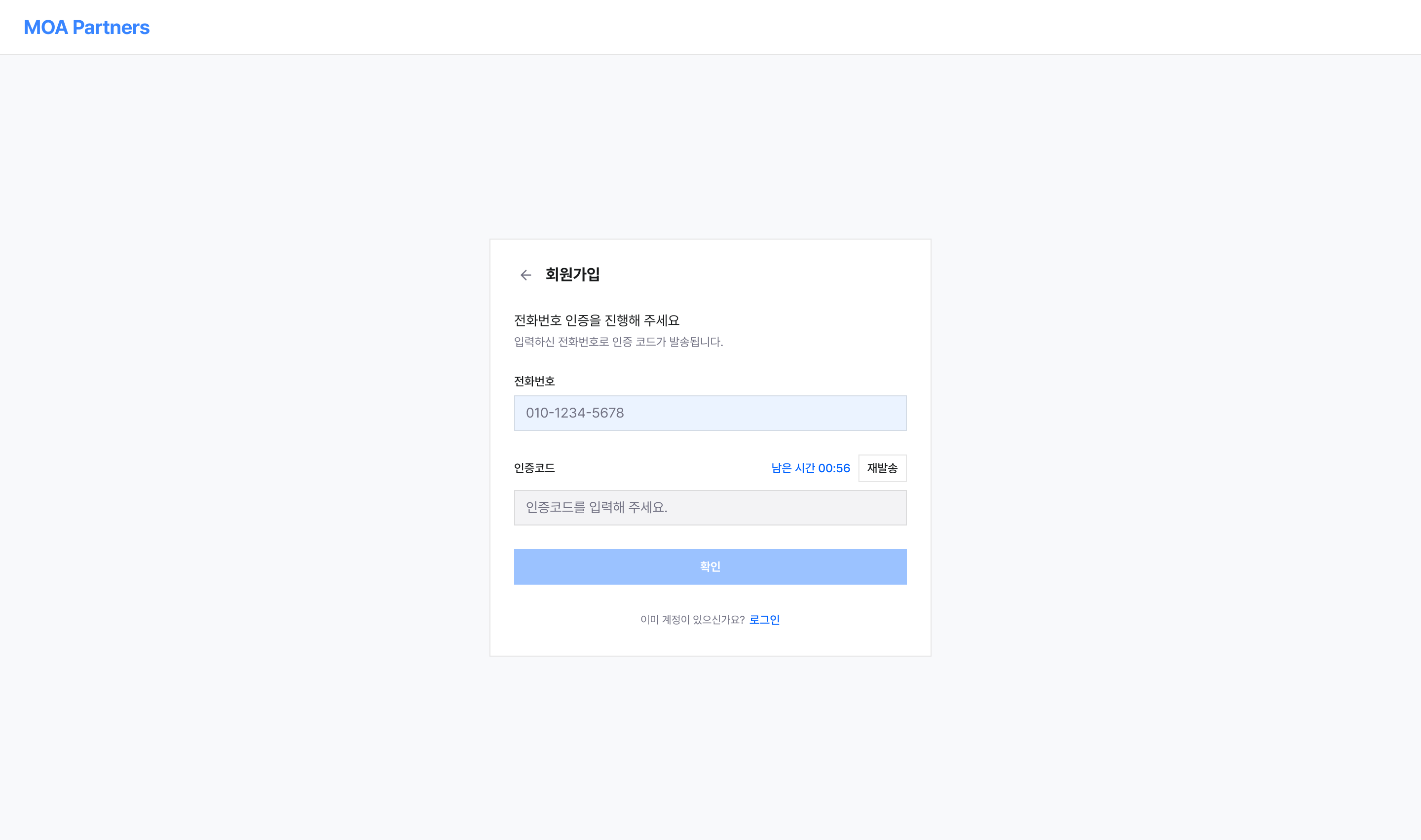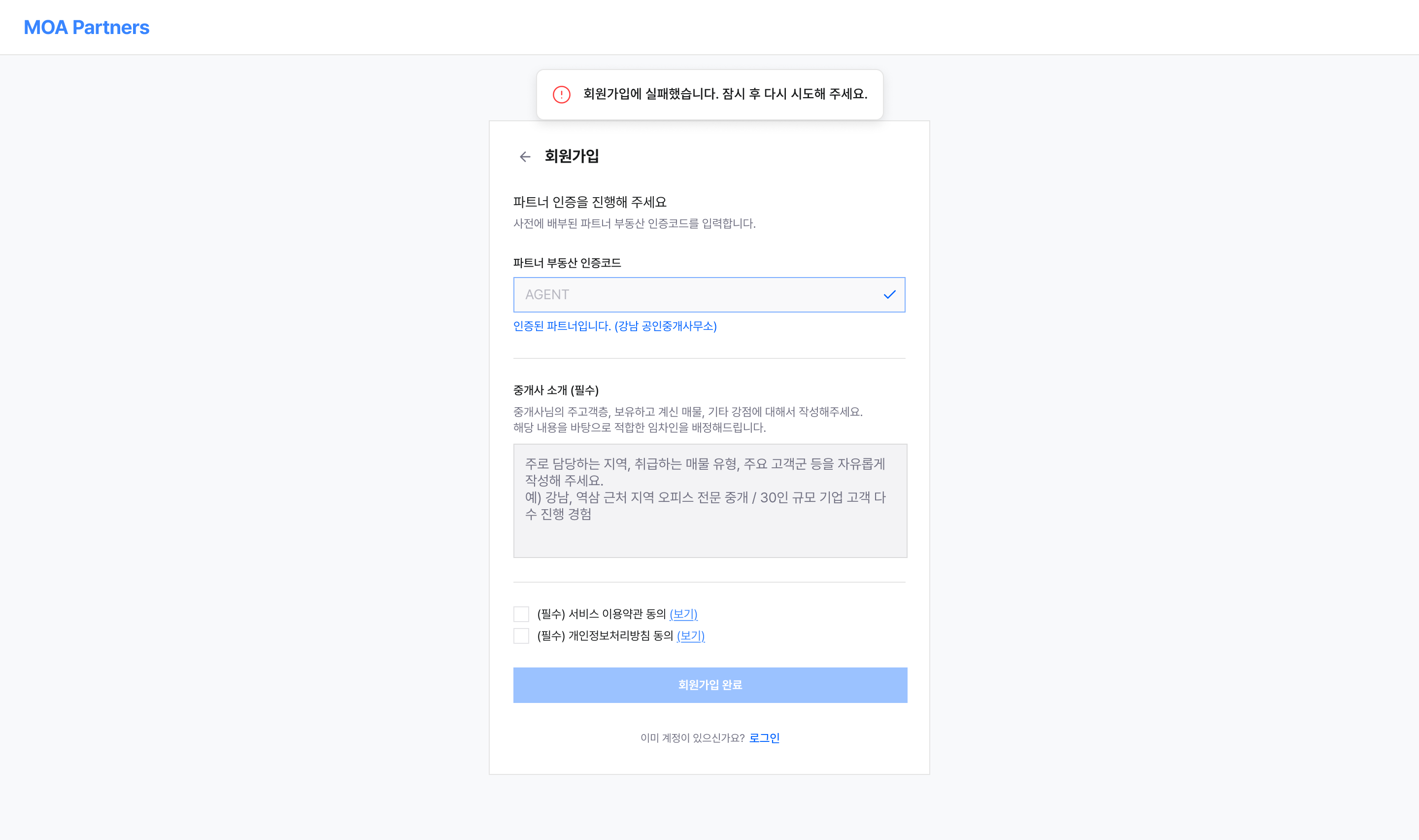 partners.moa.estate 에서 회원가입 및 로그인을 진행할 수 있습니다.