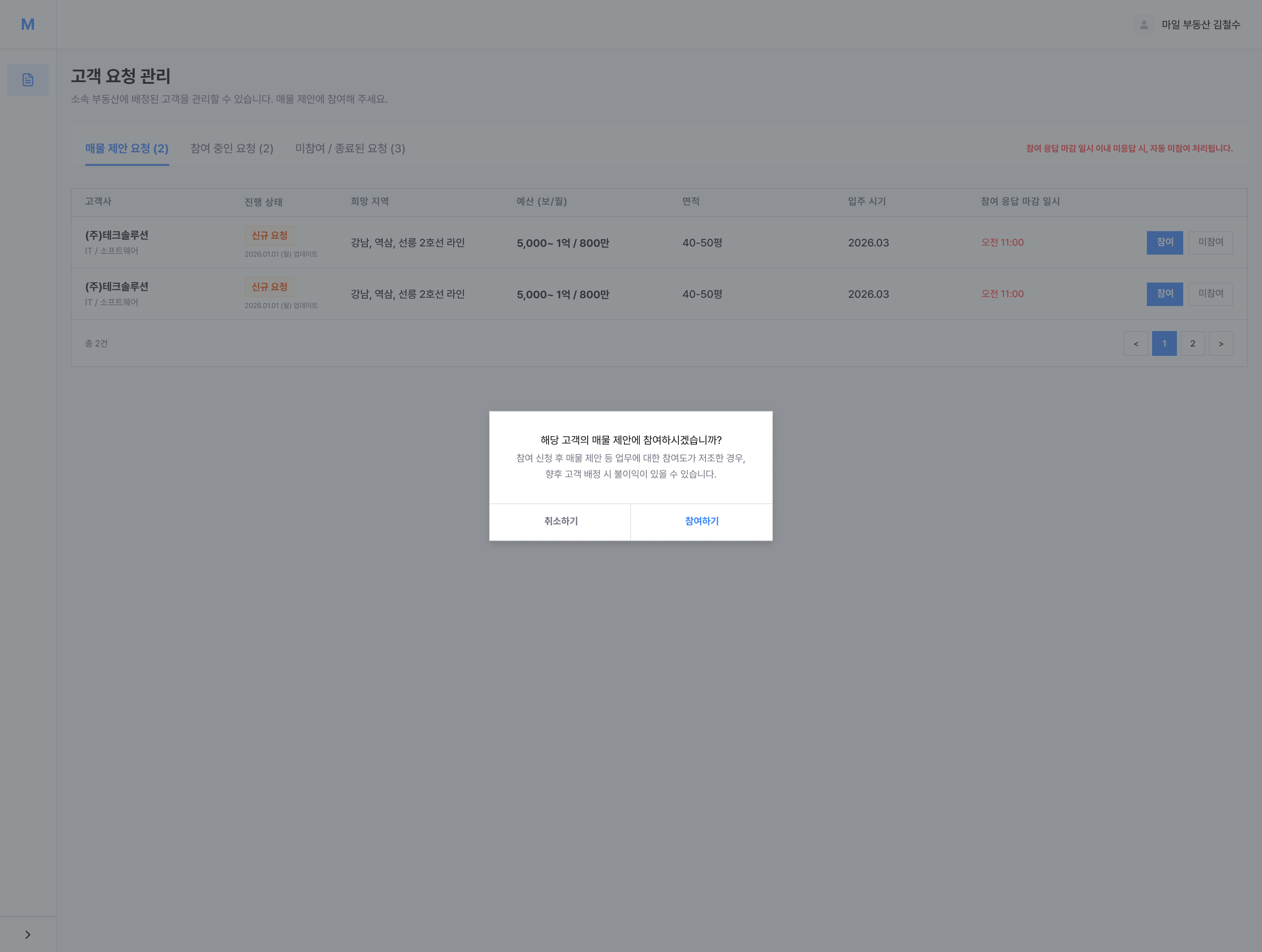 새로 등록된 매물 제안 요청을 확인할 수 있습니다. 고객의 주요 조건(위치, 면적, 예산 등)을 검토한 후 참여 여부를 결정하세요.